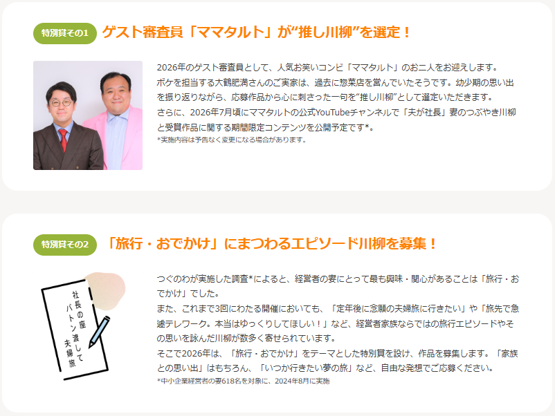 ご応募いただいた作品の中から、「最優秀賞」(1作品)、優秀賞(3作品)、「特別賞:ママタルトの“推し川柳”賞」(1作品)、「特別賞:旅行・おでかけ川柳賞」(1作品)、「奨励賞」(5作品)、「佳作」(15作品)を選出いたします。